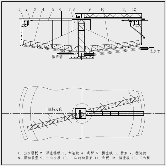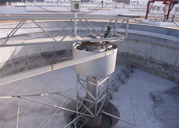 用途及簡介: CG垂架式中心傳動刮泥機適用于中心進水、周邊出水、中心排泥的重、大型池徑的輻流式沉淀池,主要用于城鎮(zhèn)污水處理廠二次沉淀池的排泥。 結(jié)構(gòu)和工作原理: CG垂架式中心傳動刮泥機主要由工作橋、中心驅(qū)動裝置、中心旋轉(zhuǎn)豎掛、刮臂、中間拉桿、拉筋、導流筒及撇渣排渣等部件組成。 該設備采用中心傳動、垂架式,污水從進水管流入導流筒擴散后,均勻的向周邊呈輻射狀流出,呈懸浮狀的污泥經(jīng)沉淀后沉積于池底,驅(qū)動裝置帶動中心豎架旋轉(zhuǎn),并帶動刮臂及刮泥板轉(zhuǎn)動,將污泥從池周刮向中心集泥槽后,靠池內(nèi)靜水壓由排泥管排出池外。水面的浮渣通過撇渣裝置撇向池邊,再由刮渣耙刮進排渣斗內(nèi)排出池外。而上清液則通過出水堰板溢入出水槽內(nèi)排出。 電氣控制:可根據(jù)用戶需要設定設備的啟、停及運行時間,可帶PLC接口。