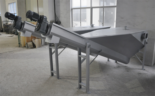 砂水分離器設(shè)備一般螺旋傾角為25~30°之間,砂水混合液從進(jìn)水管進(jìn)入本設(shè)備,混合液通過(guò)分離機(jī)上部的聚集箱,在水流的作用下,使混合液的砂粒與有機(jī)物進(jìn)行分離,砂水進(jìn)入集砂槽中,比重較大的顆粒(如砂粒)由于自重而下降,沉積于螺旋槽底部,在螺旋葉片的推動(dòng)下,物料沿斜置的U型槽底部提升,離開液面后,繼續(xù)上移一段距離,砂粒中的水分逐漸在螺旋槽葉片的空隙中流回水箱,砂粒液逐漸干化到出料口處,依靠自重落入其他輸送裝置中,上清液則不斷從排水堰溢流出去,有機(jī)物在水流漩渦的作用下,也跟著上清液從溢流槽流出,回流至污水井中,從而達(dá)到砂水分離的作用。
