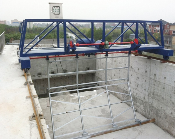 概述: 該設(shè)備適用于逆向流平流式沉淀池及沉砂池中污泥,砂及浮渣的機(jī)械排除,多用于初次沉淀池,逆向流刮泥順流排渣,刮泥機(jī)構(gòu)在不刮泥回程時刮泥耙全部抬起,當(dāng)回到刮泥的起始位置時,刮泥耙落下。 設(shè)備結(jié)構(gòu)及工作原理: 該設(shè)備由護(hù)欄、刮泥桁架、刮泥耙及導(dǎo)軌、刮泥橋、行走輪、軌道、提升機(jī)構(gòu)、驅(qū)動機(jī)輪等組成。 刮泥機(jī)構(gòu)在不刮泥回程時刮泥耙全部抬起,當(dāng)回到刮泥的起始位置時,刮泥耙落下,這樣周而復(fù)始的工作,該設(shè)備為同向流刮泥和刮渣,刮起泥耙靠卷揚(yáng)機(jī)構(gòu)升降,刮浮渣耙靠電動桿升降,以達(dá)到刮起泥渣的目的。