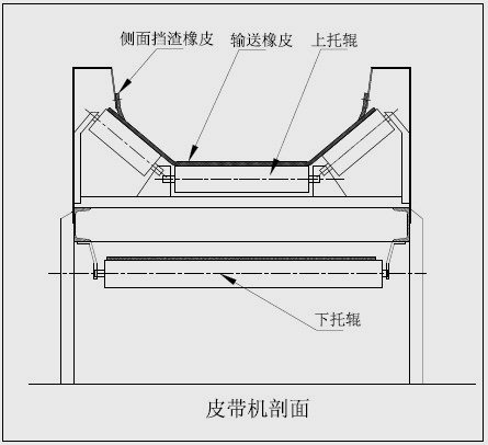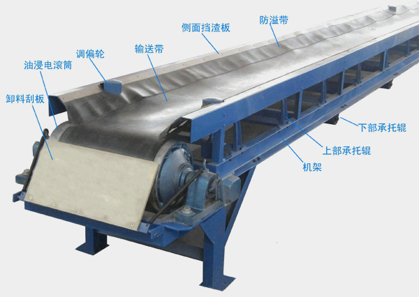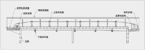 油浸電滾筒(傳動電機(jī))帶動輸送皮帶在承托輥上運(yùn)動,落入帶上的固體物隨輸送帶一起運(yùn)動,一直輸送到帶的另一端,完成輸送過程。 帶式輸送機(jī)主要由油浸電滾筒、副滾筒、機(jī)架、輸送帶、上部承托輥、下部承托輥、調(diào)偏滾、裝緊裝置、卸料板等組成。