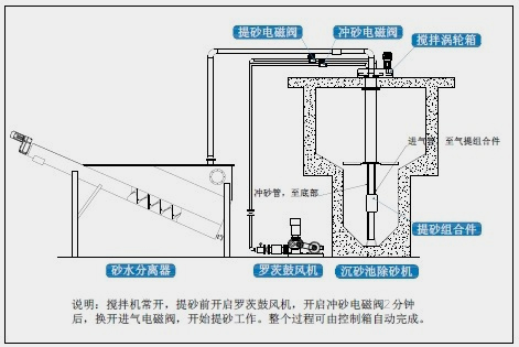 由于葉輪葉漿向上傾斜,旋轉(zhuǎn)時(shí)將使池中的污水呈螺旋狀加速,形成渦流態(tài),產(chǎn)生留心力。同時(shí)池內(nèi)污水流在葉輪葉片攪拌剪切力的作用下,互相剝離,依靠砂的自身重力和旋流的離心力,使砂粒沿池壁呈螺旋線加速沉降,向中心砂斗積聚,經(jīng)氣提或泵提升后排出池外作進(jìn)一步的處理。在此過程中,適當(dāng)?shù)臉~角度和線速度條件,使污水中的砂粒受到?jīng)_刷,并保持好的沉降效果,而原來粘附在砂粒上的有機(jī)物,以及重量小的物質(zhì),隨污水一同流出旋流沉砂池,進(jìn)入后續(xù)工序繼續(xù)處理,砂與少量污水進(jìn)入池外砂水分離器內(nèi),砂經(jīng)分離后外排,污水回流至格柵井。
